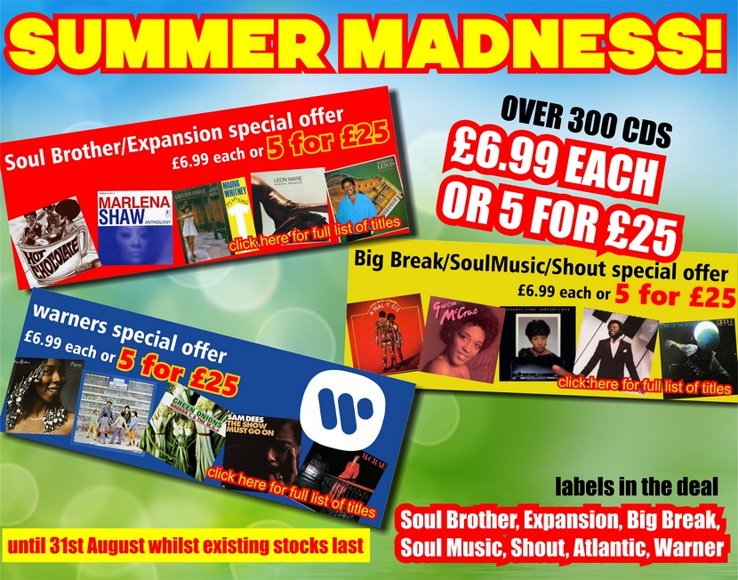 Don’t miss out on our Summer Madness CD sale, our best ever offer with over 300 classic titles on CD to choose from at £6.99 each or 5 for £25. It includes many now deleted great Soul, Funk and Jazz albums from the Soul Brother and Expansion labels, Big Break, Soul Music and Shout labels whilst stocks last plus Warner and Atlantic Jap CDs. We are adding sound clips to all the Soul Brother and Expansion titles so you can check out any you are not familiar with. At £5 each when you buy a deal of 5CD’s this is incredible value for money. The plug in error is now corrected and you can selected across all three categories to build a 5 for £25 deal. Shop Summer Madness now